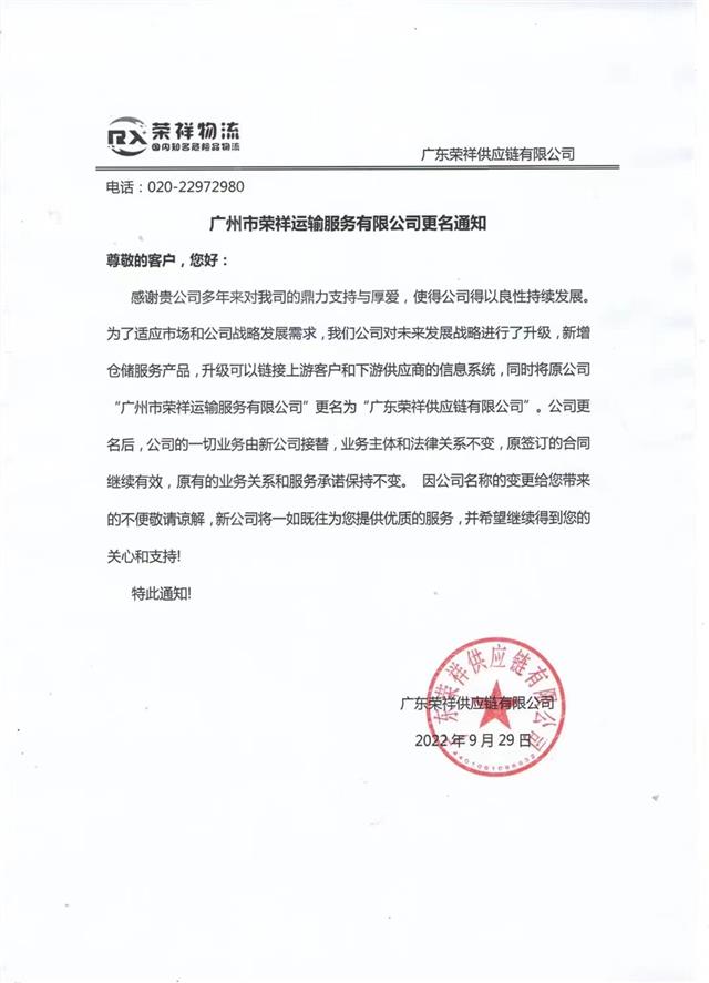 感谢贵公司多年来对我司的鼎力支持与厚爱,使得公司得以良性持续发展。为了适应市场和公司战略发展需求,我们公司对末来发展战略进行了升级,新增仓储服务产品,升级可以链接上游客户和下游供应商的信息系统,同时将原公司〞广州市荣祥运输服务有限公司〞更名为“广东荣祥供应链有限公司〞。公司更名后,公司的一切业务由新公司接替,业务主体和法律关系不变,原签订的合同继续有效,原有的业务关系和服务承诺保持不变。因公司名称的变更给悠带来的不便敬请谅解,新公司将一如既往为您提供优质的服务,并希望继续得到您的关心和支持!特此通知!