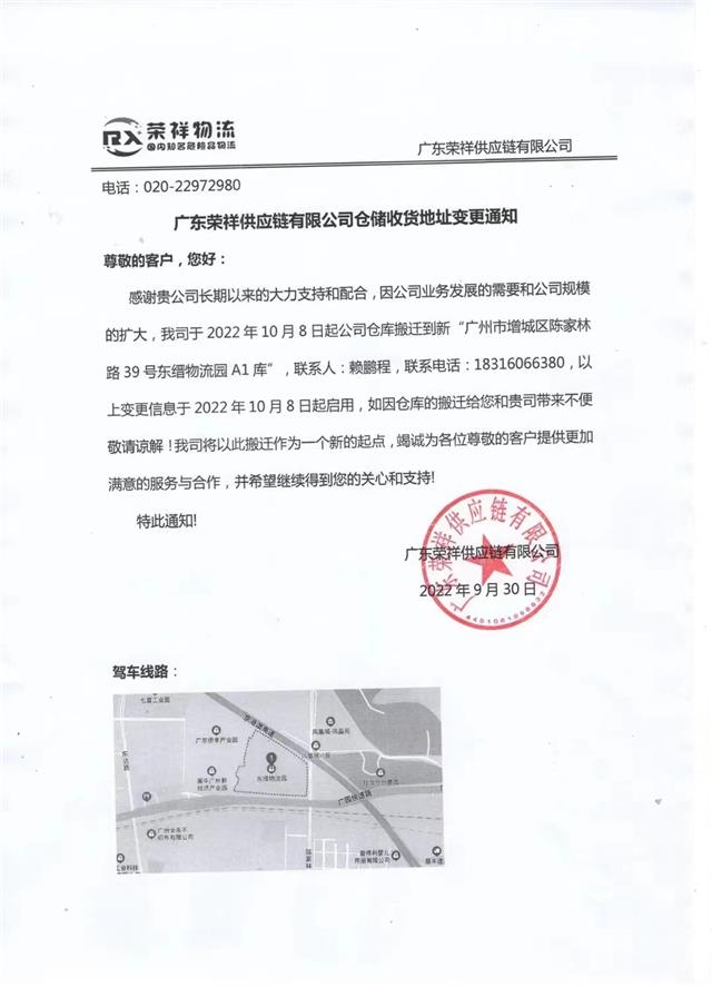 广东荣祥供应链有限公司仓储收货地址变更通知